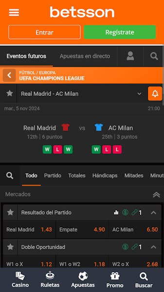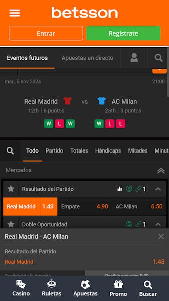 Al entrar en mi cuenta de Betsson, busco directamente el partido de Champions entre el Real Madrid y el Milan. La plataforma muestra rápidamente todas las opciones de apuesta: desde el marcador final hasta quién marcará primero o cuántos goles se anotarán en la primera mitad. Selecciono la cuota para la victoria del Madrid (1.43), que se resalta en naranja como confirmación.