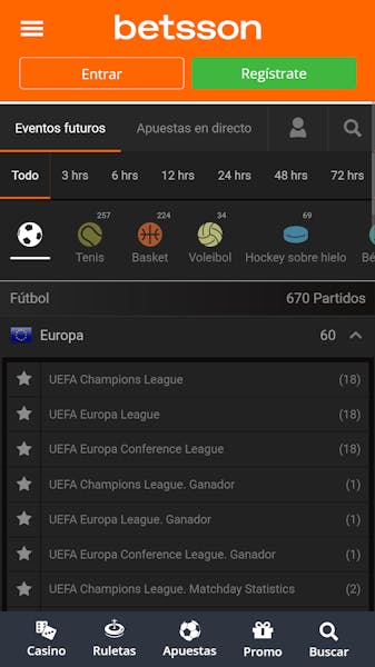 Ofrecen más de 30 deportes, desde los típicos como fútbol, baloncesto y tenis hasta los menos convencionales como snooker y hockey sobre hielo. Los esports también ocupan un lugar importante dentro de la oferta de Betsson, con prácticamente todas las opciones populares como Counter Strike, Dota 2 y League of Legends.