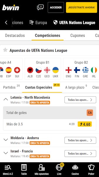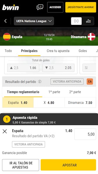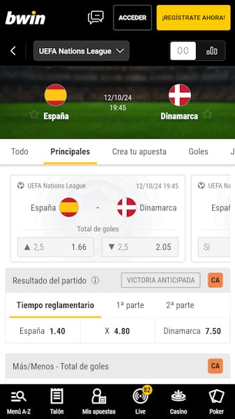 Después de registrar mi cuenta en Bwin y realizar el depósito, decidí apostar en el partido de la Liga de Naciones de la UEFA entre España y Dinamarca, en octubre de 2024. Navegar hasta el evento fue sencillo: solo tuve que buscar la competición la sección de deportes y luego el partido dentro de ella.