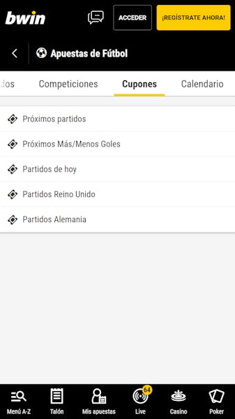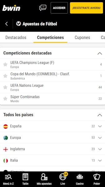 Cuando selecciono un deporte en Bwin, tengo la opción de filtrar de inmediato por país, o elegir entre cuatro pestañas: destacados, competiciones, cupones y calendario.