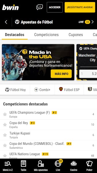 Al probar la plataforma de Bwin, lo primero que me llamó la atención fue la útil organización de la pantalla de inicio: competiciones destacadas, próximos eventos, destacados en vivo, combinadas más apostadas y hasta apuestas recomendadas.