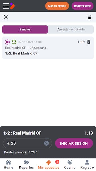 - Selección de eventos y apuestas: Elegí el evento que me interesaba (Real Madrid - Osasuna en LaLiga 2024/45) y seleccioné una cuota (en este caso una simple, pero puede ser combinada).