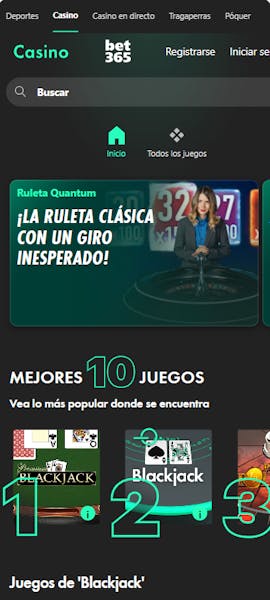 El catálogo de juego de Bet365 ofrece un abanico de posibilidades muy amplio. Es mucho más que un casino online con tragaperras, también encontrarás juegos de mesa como el blackjack o la ruleta y casino en vivo.