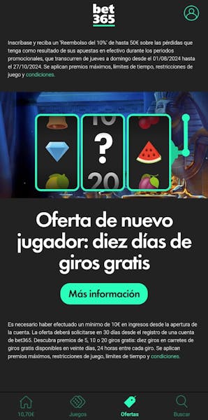 🎁 Por último, los bonos de casino de Bet365 se centran en general en los giros gratis, con lo que si te gustan este tipo de promociones, sin duda es un sitio web que debes visitar.