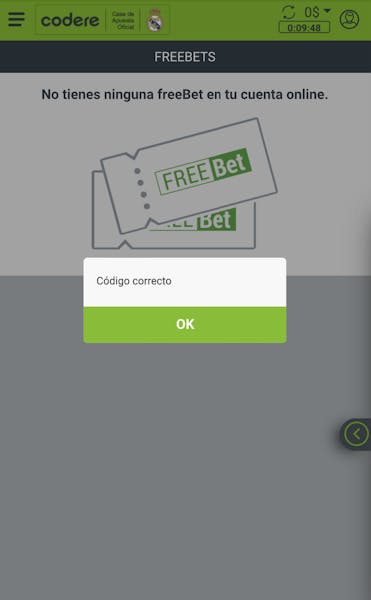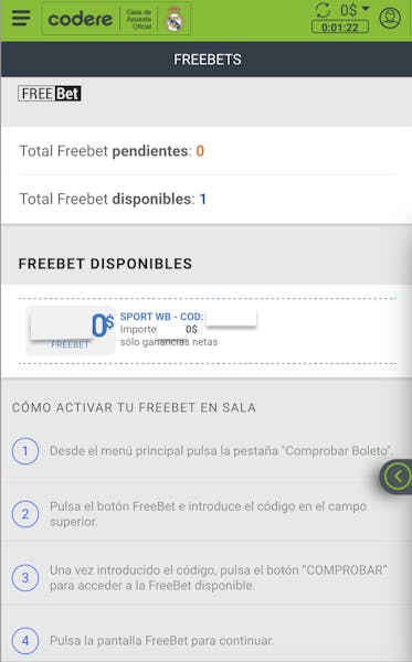 Inicialmente, vi que la pestaña “Bonos” tiene dos opciones, siendo una de ellas la de freebet, que es donde suele alojarse cada código de cupón Codere o código promocional Codere que puede usarse en apuestas deportivas en el caso de que tuvieras alguno.