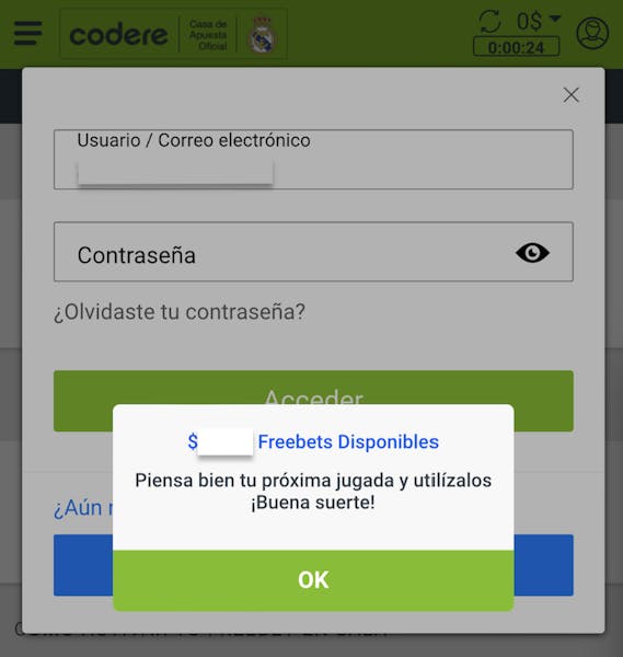 - Cuando hayas apostado el valor de tu primer depósito en total, obtendrás una freebet Codere del mismo valor, hasta un máximo de $100.000.