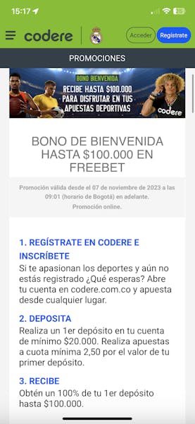 | Bono bienvenida Codere 💰 | Freebet de hasta $100.000 |