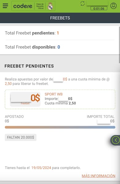 Recuerda que para acceder al bono freebet Codere, debemos depositar al menos 20.000 pesos para recibir la promo de bienvenida.