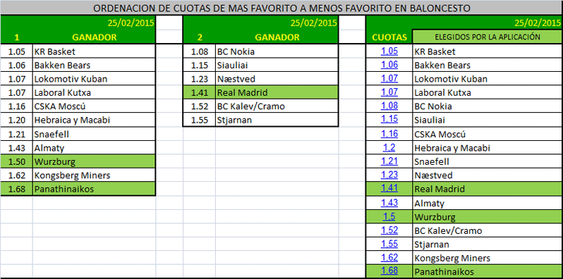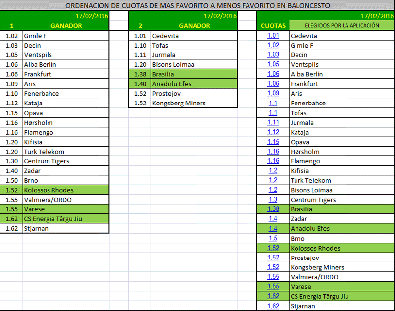 Ordeno las cuotas de más favoritas a menos favoritas hasta la cuota que la aplicación le digo que busque pronósticos, en las dos primeras columnas tenemos ordenados los equipos, cada uno en el lugar que sale en los programas, es decir el 1 como local y el 2 como visitante, y la tercera tabla juntando ambos para observar como elige la aplicación sus favoritos, los señalados con fondo verde son los elegidos por el excel, así podremos ver a nivel de cuotas como se comportan tanto en acierto como en fallo.