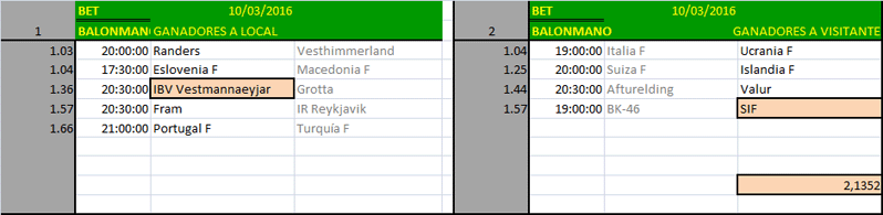 Noruega F, Skövde, Haukar y Kehra , la cuota nos llega al 1.99 y el stake lo ponemos en 1/10.