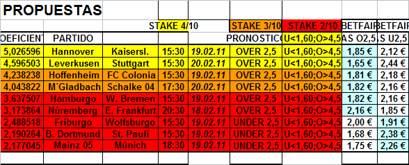 Propuesta over/under 2,5 goles ligas europeas y españolas,18-19-20-21 febrero 2011. Presento en este post los nuevos unders/over al 2,5 goles para las ligas españolas y europeas ,para esta jornada ,a celebrar los dias 18-19-20 y 21 de febrero 2011.