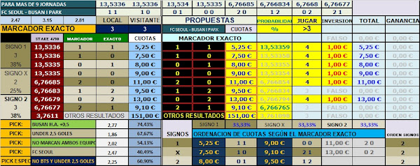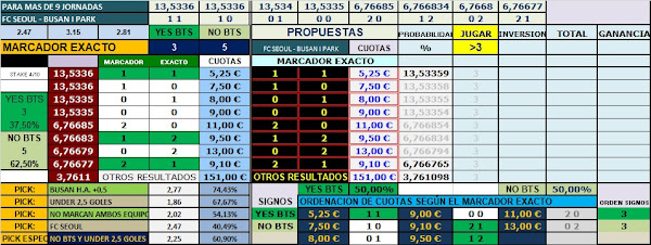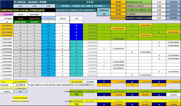 Partido de la liga de Korea del Sur, juegan el Seoul y el Busan, para el pronóstico voy a buscar el under 2.5 goles,ocupan las plazas 8 y 9 de la clasificación, viene muy apretado en cuanto a goles, pero pienso que se puede producir, salen a una media de goles por encuentro alta, 2.8 para los de la capital y 2.5 para los visitantes, en cuanto a los que llevan por encima de la línea marcada para el prono, salen los locales a 10 over y 8 under, mientras que los visitantes salen a 8 por encima y 10 por debajo, eso en cuanto a números globales, cuando el Seoul juega de local, tiene 3 partidos por encima de la línea y 5 por debajo de esta, el Busan, se planta como visitante en 4 por encima y 5 por debajo.