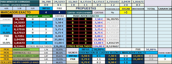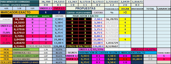 Centrados en el pronóstico, el under 2.5 goles, los locales están siendo un equipo under al 2.5 goles, de sus 7 disputados, tienen 5 donde cumpliríamos el pronóstico, los visitantes llevan 3 por arriba de la línea y otros 3 por debajo de los 2.5 goles, la media de goles que hacen por encuentro la tenemos en el Atlético en el 2.5 goles, y en el Coritiba mucho más costosa, en el 1.6 goles.