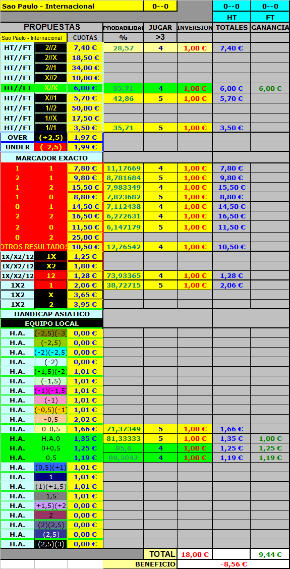 He añadido la tabla de HT/FT,ES DECIR,resultado al descanso y al final del encuentro,para ello los datos a manejar son el número de repeticiones de las 9 posibilidades que tiene este tipo de apuesta,tomando para ello las cuotas de betfair,y poniendo como mayor probabilidad de que se cumpla todos aquellos que superen al menos un 30% de resultados en cada una de las posibles soluciones,viendo que las cuotas son altas,podemos coger dos o tres resultados,la forma de hacerlo es tomando al equipo local y al equipo visitante cada uno en su papel y una vez realizada esta toma de datos,juntarlos para ver el % que puede conseguirse.
