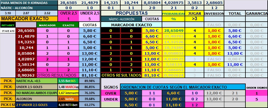Para este encuentro y mirando lo que han hecho ambos, por aquello de que las rachas se rompen y el Nàstic necesita una victoria y el Alcorcón ya le vendría bien una derrota, me he decantado por el mercado under 2,5 goles, los locales llevan de los ocho que han jugado 6 partidos por debajo de esta línea y concretamente en casa, de los cuatro que han jugado en tres de ellos cumplen el pronóstico.