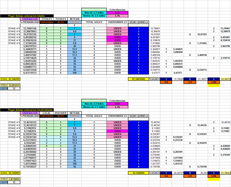 Lo que por ultimo nos genera la columna de la izquierda,en color azul marino,la que nos marca el signo quinielistico y nos da un porcentaje segun la probabilidad de cada uno de los resultados exactos analizados,pudiendo observar por separado el porncentaje que sale tanto al uno,a la equis o al dos,agrupados,viendo tambien su cotización.Importante es apreciar junto a estos,una celda de color amarillo intenso,que nos indica los resultados exactos desde el cero hasta el tres,que tienen en ese partido,eso quiere decir,que si el porcentaje es por ejemplo 63,sabemos que con esos resultados,despues,existen ademas un porcentaje del 37% que puede superar el numero de goles,la mayoria de los casos,ronda mas del 85%,bien,pintado en amarillo claro el mayor de los porcentajes de las probabilidades del signo que puede ser mas factible que se acierte.