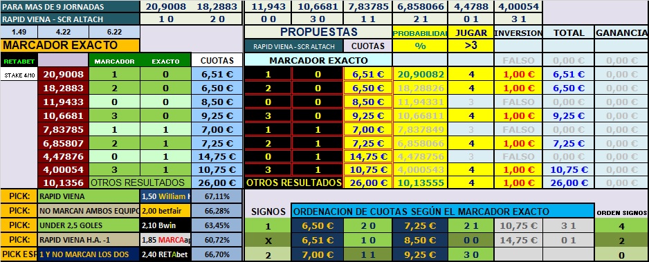 0-0, 3-0, viendo que de los seis resultados con las cotizaciones más bajas, es decir, las más favoritas para las casa de apuestas, en cuatro de estas se contempla la victoria del Rapid de Viena. Sus cuotas las encontramos entre 6.50 y 9.25.