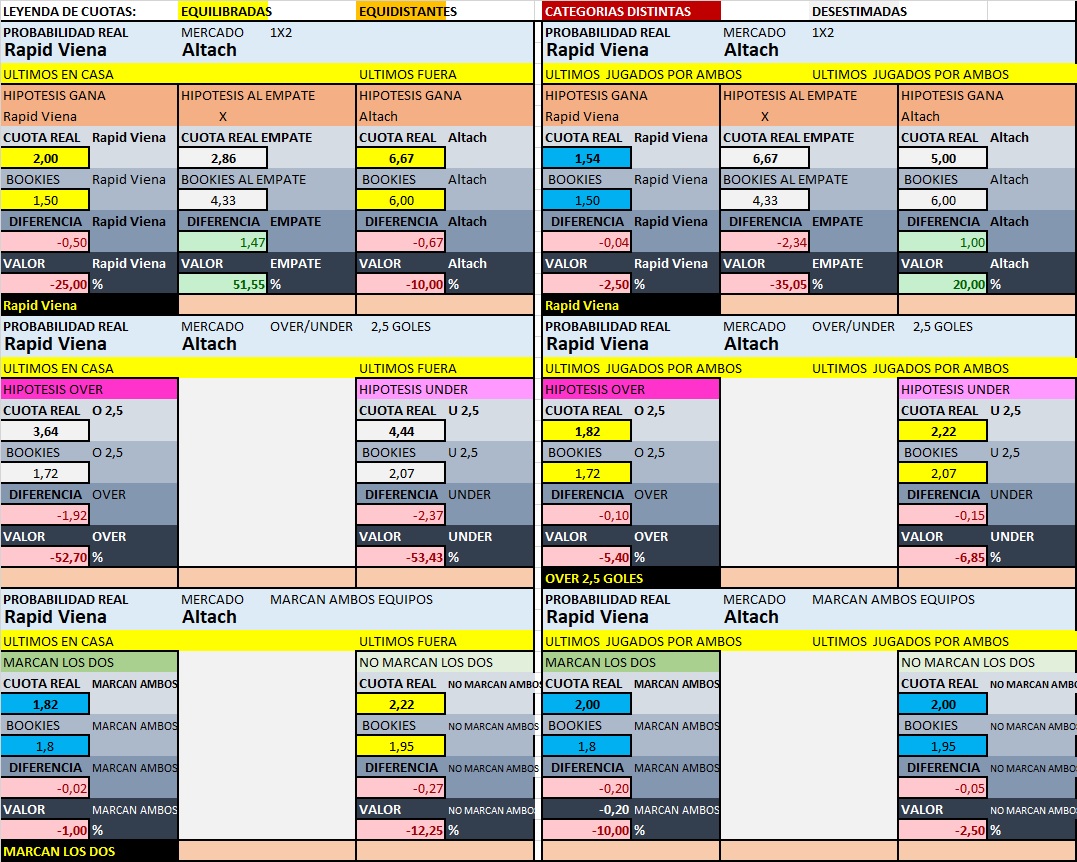 En cuanto a los goles que marcan y encajan, los del Rapid tiene 27 marcados y 20 encajados, en 16 jornadas disputadas vemos que tienen facilidad para marcar, y aunque son sobrios a la hora de encajar, le hacen goles, mientras que el Altach, ha marcado 19 y lleva encajados 22, como vemos es un equipo que marca y le marcan, así, si nos vamos al mercado over/under con la línea en el 2.5 goles, tiene igual número de encuentros por arriba que por debajo de la línea, 8-8, mientras que el Rapid di que tiene más partidos por encima de esa línea que por debajo, 10-6.