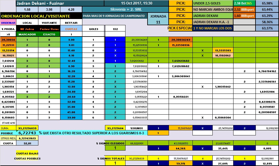 El excel, claro, con estos números, se va con la victoria del equipo local, y el marcador exacto, nos muestra las victorias por 1-0 y 2-0 como mejores opciones que puedan producirse, entre ambos resultados nos llevan hasta el 35% de posibilidades de que se pueda cumplir, seguidos de los empates a cero y a uno, entre ambos nos suman un 23% de probabilidades de que se cumplan, seguidos, de las victorias locales 3-0 y 2-1, continuando como mejor séptima opción con la victoria del Fuzinar por 0-1, con un 7% de posibilidades de que salga este resultado, para terminar con una nueva victoria local por 3-1.