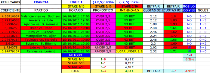 OVER/UNDER 2,5 GOLES,FUTBOL,SABADO Y DOMINGO 15 Y 16 OCTUBRE 2011.