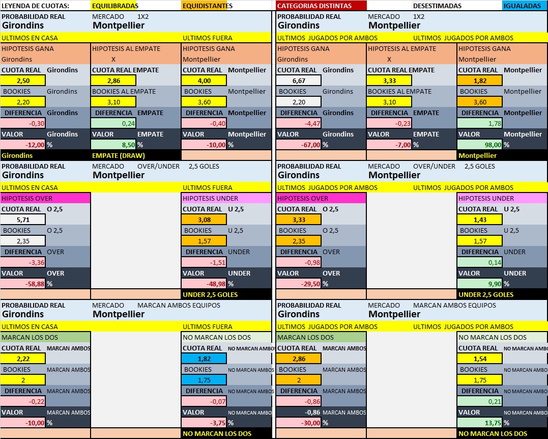 La probabilidad real también nos da un equilibrio, como ya sabéis, utilizo un par de métodos para averiguar la cuota que doy como punto de partida a los tres signos que podemos utilizar a la victoria del equipo local, al empate entre ambos conjuntos, y a la victoria del equipo visitante, también, y cuando proceda, estos mismos métodos, los utilizo para sacar la cuota del mercado over/under y el que si algún equipo se queda a cero goles o marcan ambos equipos, uno de ellos es tomando a cada equipo como actúa en el encuentro, es decir, si lo hace de local, sólo cogemos los partidos que ha jugado a local, y el equipo que hace de visitante, pues tomamos todos los encuentros que ha disputado de visitante, y el otro método, es el que da igual como juegue, cogemos sus últimos disputados, y los comparamos con los que nos dejan las casas de apuestas, en este caso, podemos observar lo que nos sale con ambos métodos respecto a lo que marcan las bookies, en este caso, contando con el pronóstico que voy a seguir, nos deja la probabilidad a la victoria de los locales por ambos métodos con la cuota 2.50 y 6.67, en el mercado la tenemos en 2.20, el empate por dos métodos nos dejan las cuotas 2.86 y 3.33, con el mercado en 3.10, y la victoria del visitante nos sale con cuota 4.00 y 1.82, las bookies la ponen en 3.60, como observamos las cuotas en el primer método, no nos deja dudas, favorito el local, Girondins por sus números como comenté antes, mucho mejor en su campo, y la cuota del Montpellier fuera, ya que no es el mismo que lo hace en casa, lo que nos ajusta al pronóstico que buscamos, todo lo contrario, que el otro método, donde nos deja que el visitante lleva mucha mejor trayectoria que el local en los que llevan ambos en liga.