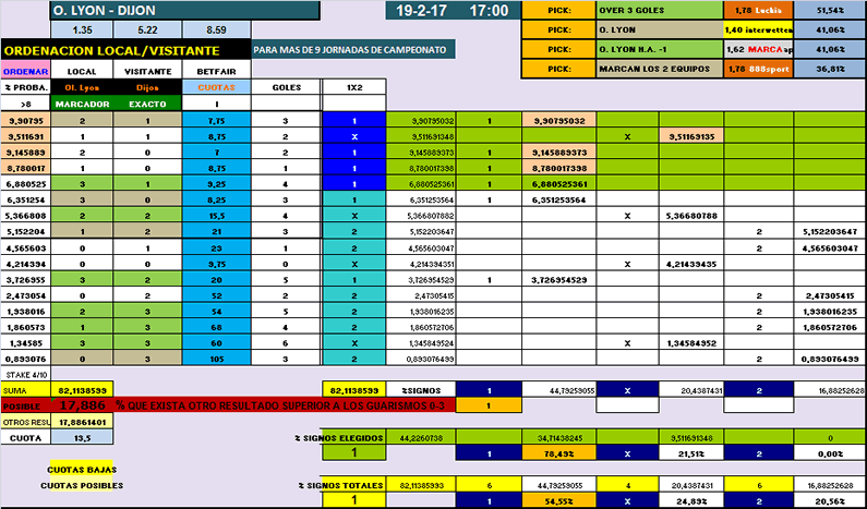Como local el Lyon, nos muestra, 8 victorias por 4 derrotas, en doce partidos, 25 goles a favor y 13 en contra, media de 2 marcados por partido y 1 encajado por partido. El Dijon como visitante, sólo ha conseguido 1 victoria por 4 empates, completado con 7 derrotas, 13 goles a favor y 22 en contra, saliendo prácticamente a 1 a favor de media por encuentro y a 2 encajados.