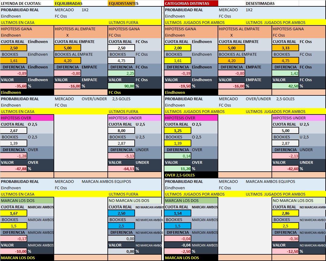 En cuanto a los goles que marcan y encajan, los del Eindhoven tiene 23 marcados y 26 encajados, como vemos, ambos dígitos por encima de los partidos que llevan jugados, y eso sí, con más goles encajados que marcados, aunque sea por poco, mientras que el Oss, ha marcado 21 y lleva encajados 28, como vemos es un equipo que hace goles, pero también le hacen, así, si nos vamos al mercado over/under con la línea en el 2.5 goles, ambos conjuntos tienen los mismos partidos al over que al under, superando por 11-4 la línea al 2.5 goles.
