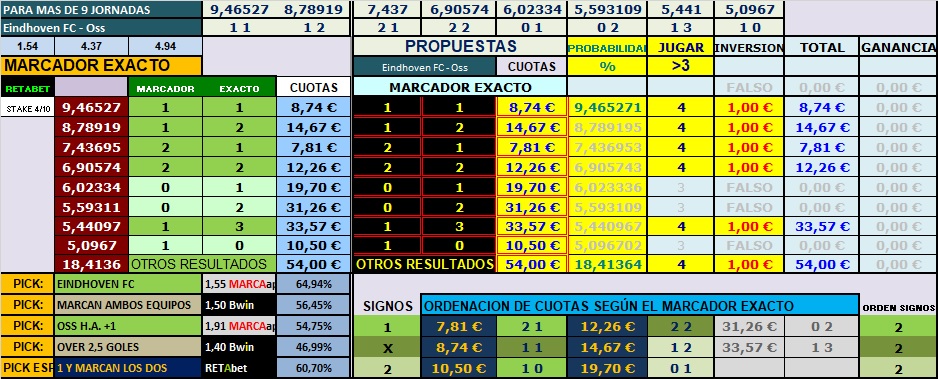 El excel como pronóstico a buscar, y por lo que he explicado, me gusta el mercado marcan ambos equipos, los cuatro primeros resultados a marcador exacto que nos deja la aplicación son con esta característica, 1-1, 1-2, 2-1, 2-2, aparte del 1-3, que es la séptima mejor opción, y si añadimos que el apartado OTROS RESULTADOS, que nos dice que uno, o los dos equipos, pueden terminar el partido por encima del los 3 goles, apoyados, por el 11-11 de los locales en casa, y el 13-13 de los visitantes como visitantes, hace que me decante por este mercado, por delante de la victoria de los locales, ya que es curioso, pero las cuotas nos dan favorito a estos, pero la probabilidad real en uno de los métodos iguala a cuota 2.50 con unos y otros.