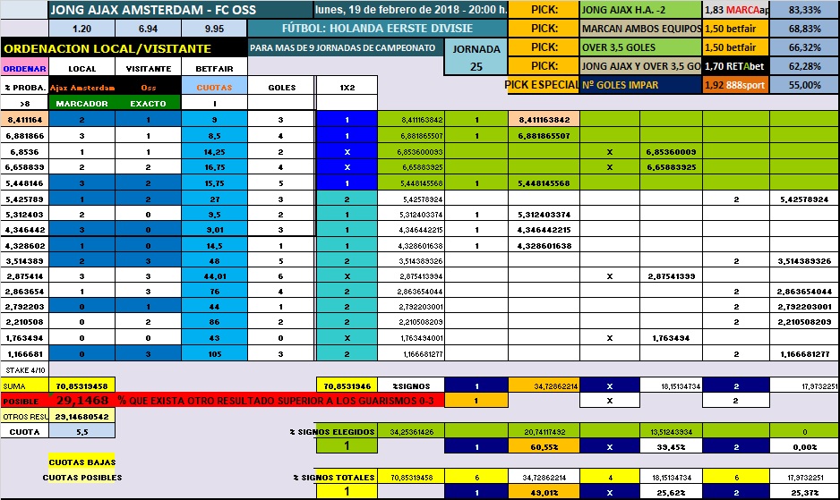 PICK FUTBOL / HOLANDA / EERSTE DIVISIE /JORNADA 25 / LUNES 19-2-2018. 20:00 JONG AJAX AMSTERDAM - FC OSS Nº GOLES IMPAR / CUOTA 1.93 / 888SPORT / STAKE 4/10 Partido de la segunda liga de Holanda, la Eerste Divisie, analizo el encuentro que disputan JONG AJAX AMSTERDAM - FC OSS, los que hoy juegan de locales, son los líderes del campeonato, después de 24 jornadas, llevan 15 victoria, 4 empate , 5 derrotas, como podemos ver, la situación los mete en la zona alta en la clasificación con un partido menos frente al NEC que iguala con ellos en lo alto de la tabla, los visitantes, el Oss, está en el puesto noveno en la clasificación, recordemos que esta liga son 20 equipos, ha conseguido 10 victoria, 6 partidos empatados, y ha perdido 8 partidos, como vemos equipo que está en la parte media alta de la clasificación, buscando el ansiado ascenso de categoría, pero a michos puntos de los de arriba, ya que tiene 36 y los de arriba llevan 42 hacia adelante. En cuanto a los goles que marcan y encajan, los del local tienen 60 marcados y 35 encajados, como vemos, hace muchísimos goles, encajar los encajan, son alegres, en 24 encuentros llevar 35 goles así lo demuestra, mientras que el visitante, ha marcado 38 y le han marcado 39, vemos que ellos, hacen y les hacen por igual, en ambas facetas por encima del número de partidos que han disputado, así, si nos vamos al mercado over/under con la línea en el 2.5 goles, los locales son el equipo más over del campeonato, 20-4, los del Oss son más amarrateguis, en lo que es este campeonato, pero siguen teniendo muchos más overs que unders, 16-8. El local como anfitrión, ha ganado 8 de los 11 que ha disputado, 2 empates, con goles marcado y encajados 27-12, como vemos mantiene las proporciones de sus globales, en este caso, hace muchos más goles que le hacen, y estos están por encima de los encuentros disputados , el Oss de visitante 3 partido ganados, 4 empate y ha perdido 5 encuentros, lleva 19 goles marcados y 23 encajados, aquí, encontramos que hacen y les hacen goles, por encima del número de partidos disputados, y les cuesta ganar, tan sólo 3 de 12 disputados, aunque los 4 empates les da respiro respecto a los perdidos. El excel como primer pronóstico, nos deja como primeros mercados la victoria de los locales con un hándicap asiático H.A. -2, yo en esta ocasión me inclino por un mercado como es el de que el número de goles sea IMPAR, los mejores resultados que nos muestra la aplicación para ir con el pronóstico, con un 55% de fiabilidad, le otorga los resultados al marcador exacto, estos resultados como digo son 2-1, 3-2, 1-2, 3-0, las opciones que nos muestra la aplicación en favor de que entre los dos equipos marquen sus goles en una serie impar. Si queremos cerciorarnos, si estos resultados no están lejos de la realidad, podemos ordenarlos, tomando la cotización de cada uno de ellos, de más favorito a menos favorito, es decir, el resultado de menor cuota, será para las casas de apuestas el que más probabilidad de que salga el que ambos equipos marque, en este caso, tomamos los seis primeros, y aquí nos salen 3-1, 2-1, 3-0, 2-0, 1-1 y 3-2, viendo que de los seis resultados con las cotizaciones más bajas, es decir, las más favoritas para las casa de apuestas, en 3 de estas se contempla que se el número de goles que se marquen en el partido sean impares. Sus cuotas las encontramos entre 9.00 y 15.75. Podemos ver que ambos conjunto en sus últimos 30 partidos disputados, para analizar si el mercado par-impar puede ser factible, podemos comprobar que en el 55% de los partidos que han disputado ambos equipos, el resultado fue impar, el equipo local tiene 19 de los 30 partidos analizados, y el visitante, 14, lo que nos lleva a el primero al 63% y el segundo al 47%, lo que hace que su probabilidad, unida a los resultados que nos deja el marcador exacto, pensando que el mercado al over/under nos sale por encima de la línea del 2.5 goles, nos mete los 2-1, 3-2, 1-2 y 3-0 entre los ocho primeros con más posibilidades, hace que se pueda cumplir. Con esta argumentación y los datos que expongo, voy a buscar que el número de goles que se marquen en el partido sea impar. ENLACE MERCADO PAR-IMPARhttps://3.bp.blogspot.com/-Xl3WdZtaFhc/WorqDyH_ujI/AAAAAAAAwLo/22isZ4Y37GspaVRKpQkxrPHn1Kdb1R_BwCLcBGAs/s1600/jpg9675.jpg ENLACE PORCENTAJEShttps://3.bp.blogspot.com/-tgQjvl8FBnc/WorqD00-DQI/AAAAAAAAwLs/QFqHrlXbUeAKgeVNYoY7l0HdbqPZjzRCgCLcBGAs/s1600/jpg9676.jpg ENLACE MARCADOR EXACTOhttps://1.bp.blogspot.com/--lJpbRormgY/WorqEI-W-lI/AAAAAAAAwLw/TK1SeONN7B8TdrzM5kfqtEvNJowyPOx-gCLcBGAs/s1600/jpg9677.jpg