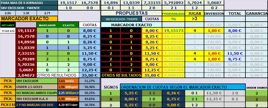 El excel como primer pronóstico, nos deja como primeros mercados la victoria del equipo local, los mejores resultados que nos muestra la aplicación para ir con el pronóstico, con un 51% de fiabilidad, le otorga los resultados al marcador exacto, estos resultados como digo son 1-0, 0-0, 0-1, 1-1, 2-0, 2-1, 1-2 y 0-2, las opciones que nos muestra la aplicación en favor de la victoria de los locales, y dando el primer resultado con un 19% y pese a que están muy disgregados tanto en empates como en victorias visitantes, nos muestra 3 de los ocho mejores resultados posibles ganadores a local.