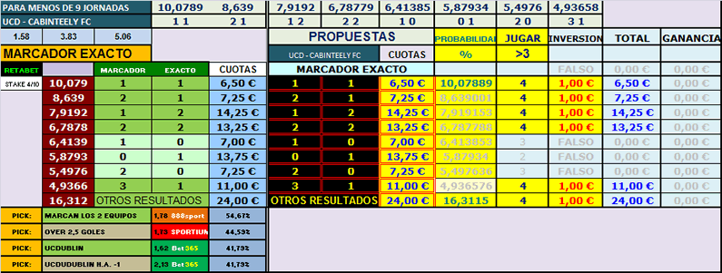 Jornada 8 de la primera división de Irlanda, juegan el UC DUBLIN con el CABINTEELY, como podemos observar es una liga donde hay muy pocos equipos, tan sólo la disputan ocho, y sólo existe el premio para el equipo que termina campeón, ascendiendo a la Premier irlandesa, estamos en el punto, donde ya han disputado una vuelta, han jugado las 7 primeras jornadas, y podemos ver, que los que hoy van a jugar de local, los de Dublin, son segundos, a un sólo punto del Waterford, que tiene 14 puntos, con 4 victorias, y 1 empate, les sacan un punto al tercero, el Shelbourne, no son un mal local, ya que de los 4 que han disputado en casa, han ganado 3 de ellos, perdiendo con el lider hasta estos momentos 0-2 el Waterford.
