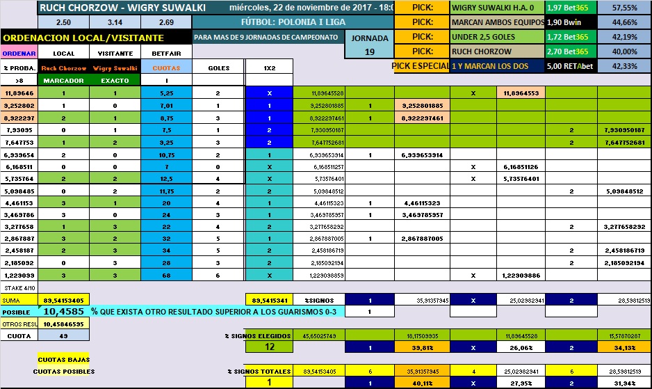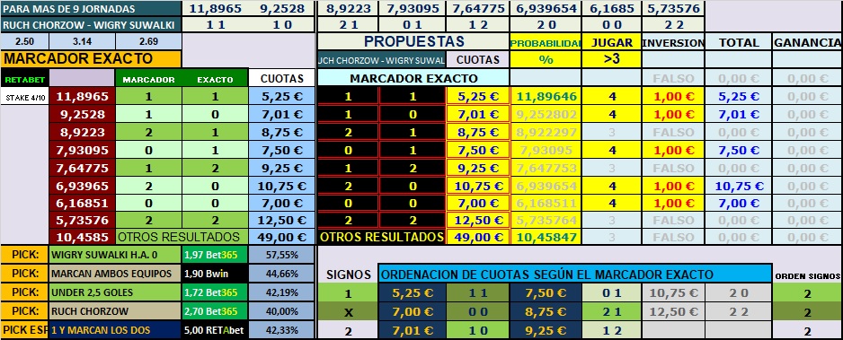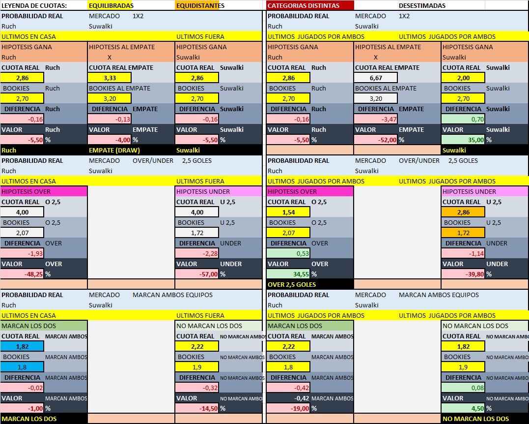 La probabilidad real también nos da un equilibrio, como ya sabéis, utilizo un par de métodos para averiguar la cuota que doy como punto de partida a los tres signos que podemos utilizar a la victoria del equipo local, al empate entre ambos conjuntos, y a la victoria del equipo visitante, también, y cuando proceda, estos mismos métodos, los utilizo para sacar la cuota de el mercado over/under y el que si algún equipo se queda a cero goles o marcan ambos equipos, uno de ellos es tomando a cada equipo como actúa en el encuentro, es decir, si lo hace de local, sólo cogemos los partidos que ha jugado a local, y el equipo que hace de visitante, pues tomamos todos los encuentros que ha disputado de visitante, y el otro método, es el que da igual como juegue, cogemos sus últimos disputados, y los comparamos con los que nos dejan las casas de apuestas, en este caso, podemos observar lo que nos sale con ambos métodos respecto a lo que marcan las bookies, en la victoria del Ruch, 2.86 en los dos métodos que analizo tal probabilidad, con la cuota en el mercado de 2.70, el empate nos deja, 3.33 y 6.67. cuando está en 3.20, la victoria del Suwalki, 2.86 y 2.00 estando sobre 2.70. Como vemos en el primer método, están las cuotas casi a la par con lo que dicen las bookies, en el segundo le da valor a la victoria de los visitantes, por lo que cuidado aquí, el marcador exacto nos dice que por porcentajes el Ruch debe de ser el ganador, pero la probabilidad real nos deja la opción de la victoria del visitante.