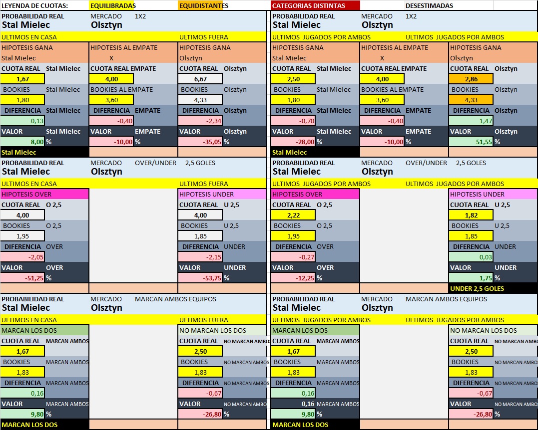 Wn casa los del Stal Mielec, en sus últimos cinco disputados, tan sólo han perdido un encuentro, hace dos partidos como local, y fué contra el segundo clasificado, del Olsztyn, en sus últimas cinco salidas, sólo un empate, 4 últimos con derrota.