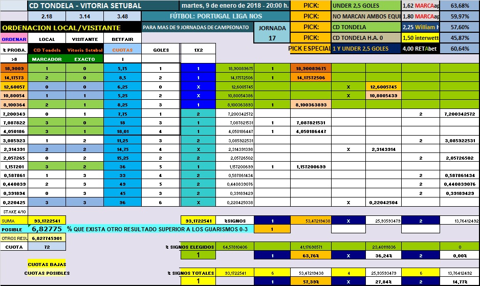 El excel como primer pronóstico, nos deja como primeros mercados el under 2.5 goles y no marcan ambos equipos, la victoria del equipo local tiene una buena cuota, los mejores resultados que nos muestra la aplicación para ir con el pronóstico, con un 57% de fiabilidad, le otorga los resultados al marcador exacto, estos resultados como digo son 1-0, 2-0, 0-0, 1-1, 2-1, 0-1, 3-0 y 3-1, las opciones que nos muestra la aplicación en favor de la victoria de los locales, y dando el primer resultado con un 19%, nos muestra 5 de los ocho mejores resultados posibles ganadores a local.