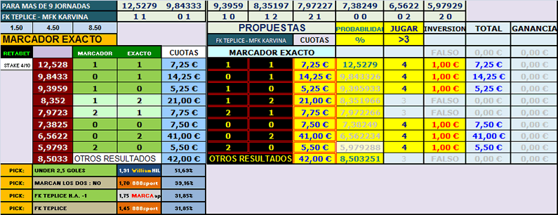 Su rival de hoy, el Karvina, con 29 puntos, a 9 del descenso, con cierta tranquilidad, debe de mejorar los 8 partidos ganados y 5 empatados, porque de los 11 que lleva perdidos, 4 son en las cuatro últimas semanas, crisis de resultados, lo peor, esta semana le ganó goleando 4-2 el colista, el Pribram, entra más en la dinámica de ser derrotado su último a local con el Slavia Prague, 1-2, que es el lider de la competición, 2-0 en casa del Liberec, anterior al del lider, y el Plzen 2-3, este también tiene su gran lógica.