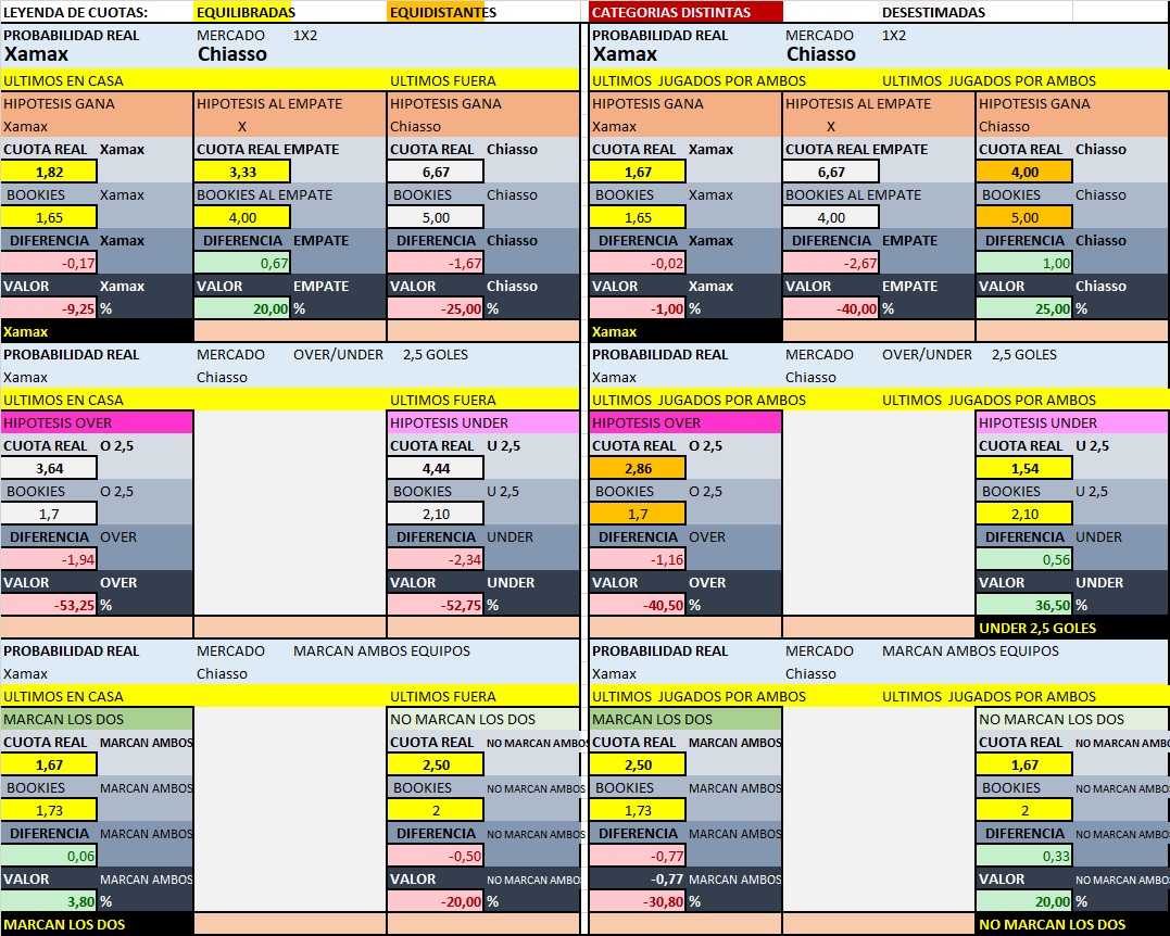 La probabilidad real de los tres signos posibles, también se equilibran con la victoria del equipo local, 1.82 y 1.67, cuando las bookies lo ponen sobre el 1.65, el empate, 3.33 y 6.67, con la cuota en los mercados de 4.00, y para la victoria visitante, 6.67 y 4.00, cuando las casa de apuestas la ponen sobre el 5.00.