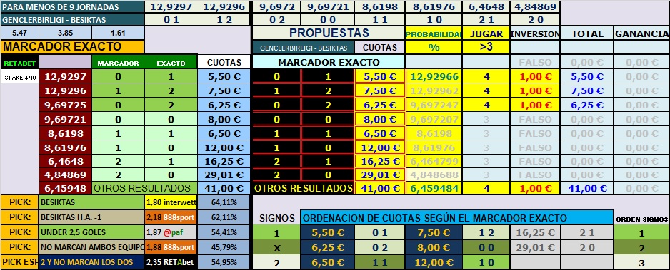 El excel, es claro, hay mucha diferencia entre los dos conjuntos, pero, el estado anímico te dice mucho, y hay que ver la entrada de los del Besiktas, se sentirán superiores, ante un rival que ha comenzado fatal, y por eso mismo, si no salen con las pilas y los cinco sentidos puestos en su tarea lo pueden pasar mal, los números como digo son claros, los resultados 0-1 1-2 o 0-2, en el análisis del marcador exacto nos lo deja como los tres mejores resultados posibles en el partido de hoy, con una probabilidad en el caso de los dos primeros del 13% cada uno, lo que ya nos deja un 26% de posibilidades para estos dos marcadores, unidos a los 9.60% del tercer resultado se nos va a los 36% de posibilidades, luego siguen los empates 0-0 y 1-1, seguidos de las victorias locales 1-0, 2-1, 2-0, como vemos algo simétricos los resultados entre visitantes y locales.