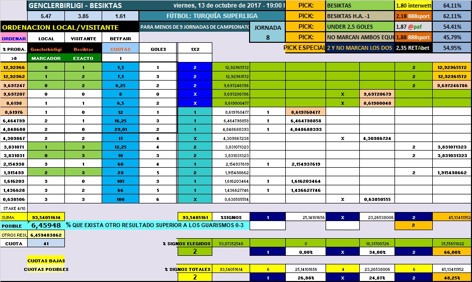 El excel, es claro, hay mucha diferencia entre los dos conjuntos, pero, el estado anímico te dice mucho, y hay que ver la entrada de los del Besiktas, se sentirán superiores, ante un rival que ha comenzado fatal, y por eso mismo, si no salen con las pilas y los cinco sentidos puestos en su tarea lo pueden pasar mal, los números como digo son claros, los resultados 0-1 1-2 o 0-2, en el análisis del marcador exacto nos lo deja como los tres mejores resultados posibles en el partido de hoy, con una probabilidad en el caso de los dos primeros del 13% cada uno, lo que ya nos deja un 26% de posibilidades para estos dos marcadores, unidos a los 9.60% del tercer resultado se nos va a los 36% de posibilidades, luego siguen los empates 0-0 y 1-1, seguidos de las victorias locales 1-0, 2-1, 2-0, como vemos algo simétricos los resultados entre visitantes y locales.