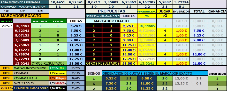 La aplicación ya le he dicho en alguna otra ocasión, no distingue si el año anterior, de donde toma los datos, es de una categoría más o menos, por lo que tenemos que tener más vista de lo normal, el excel, en esta ocasión, también se va con el favoritismo de los locales, otorgando un 53% de posibilidades de que venza, para ello, el marcador exacto nos deja el 1-1 a cuota 6.25 como mejor resultado posible, tanto en el análisis de probabilidades, como en la ordenación de cuotas, de más favoritas a menos, pocas jornadas y muchas cosas en el aire, seguramente, los resultados en favor de los locales 2-1, 1-0, 2-0, que también en la ordenación según el favoritismo de las cuotas se produce en el mismo número de orden.