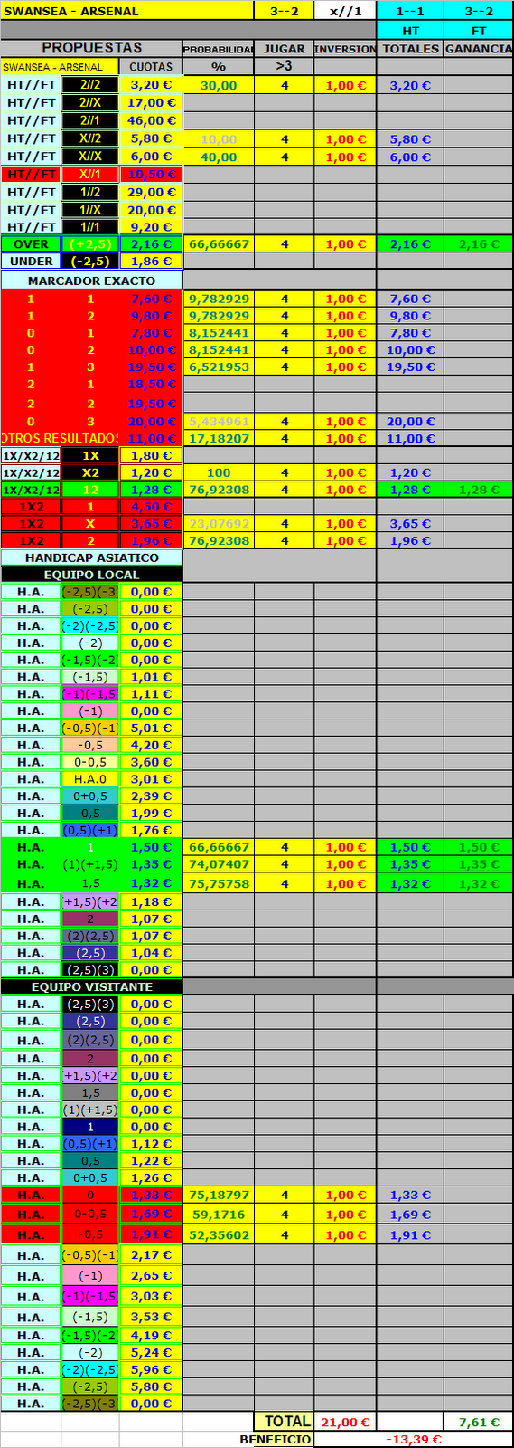 ANALISIS PARTIENDO DEL MARCADOR EXACTO.INGLATERRA PREMIER LEAGUE SWANSEA-ARSENAL, domingo 15-1-2012 .