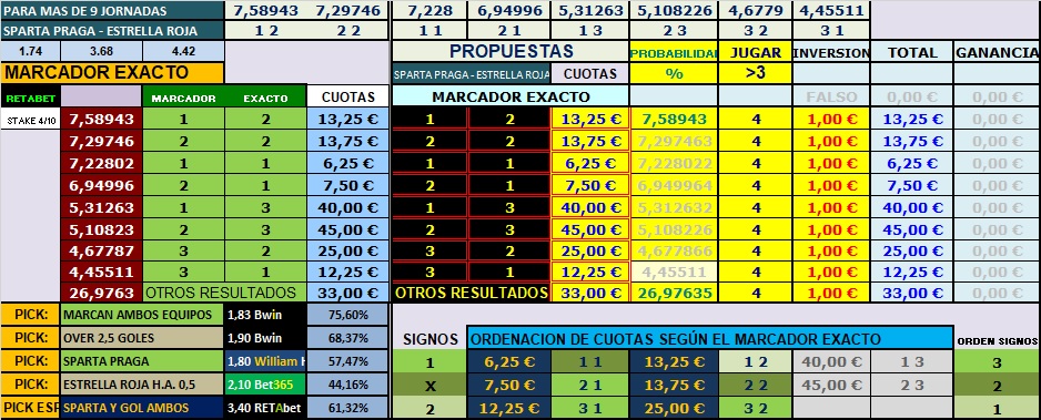 Pero cuando llegamos al punto que estamos hoy, todo esto vale de bien poco, ya que lo que está en juego es mucho, y más para esta clase de equipos, para ello he cogido los últimos 20 partidos que han jugado cada uno de los dos equipos, y bueno, nos deja unos números el excel que no dejan desapercibidos a nadie, el primer prono nos dice que ambos equipos marcan, a ver, si comienza marcando el Sparta, sabiendo que con un gol más provoca la prórroga cuanto menos si el contrario no marca, hace que abran lineas y puede producir en las contras de los de Belgrado grandes oportunidades para que estos hagan gol, de hecho el marcador más óptimo para que esto se produzca nos lo deja en un 1-2, empate a dos, seguido de un 2-1 y como cuarto un empate a uno, en todos estos resultadso marcan ambos equipos, yo voy a ir con este mercado, que no me pase como anoche, aparte de esto, ordenando las cotizaciones del marcador exacto nos muestra como mejores opciones los resultados 1-1, 2-1, 3-1, 1-2, 2-2, 3-2, estando las dos primeras entre el 6 y el 7.5, para dar un salto grande de cuota en las siguientes, de 12.25 a 25. Lo que nos indica que las bookies tienen estos resultados bien considerados para que se puedan producir.
