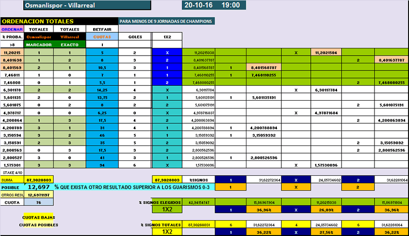 El partido será muy igualado, por lo que vamos a buscar, y como las cuotas favoritas son que va a ver pocos goles, me voy a inclinar por que ambos equipos marcan, como podemos ver en las imagenes de el excel, la primera opción con un 12% de que pueda cumplirse es el empate a un gol, lo que nos daría por acertado el pick, luego en segunda y tercera opción nos salen el 1-2 y el 2-1, con un 8% cada una de ellas de que se pueda producir, lo que también nos daría como acertado el pick, dentro de las seis primeras opciones nos queda el empate a dos goles, esta posibilidad nos deja un 6% de que pueda ocurrir, en total, suman cerca del 35% de que se pueda dar la coincidencia de que marquen los dos.