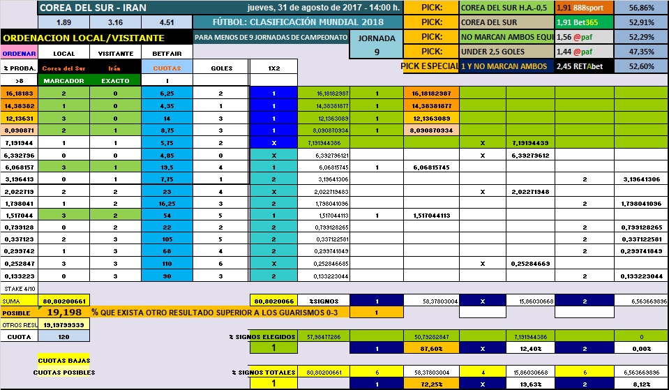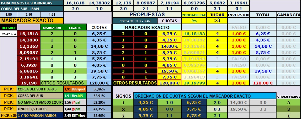 La probabilidad real, aquí y al ser selecciones, sin dejar los últimos disputados por cada uno, donde la cuota que mejora en exceso es la de Iran, de 4.5 que la tenemos por las bookies, nos baja a 2.00, pero cogiendo el que los de Corea juegan en casa y los de Iran lo hacen fuera, nos resulta todo lo contrario, la cuota de Corea estaría sobre el 2.00 y las bookies la tienen sobre el 1.91, y la de Iran se aproxima hasta el 3.33 cuando en el otro método lo teniamos en 2.00, y como digo, al ser selecciones, el jugar a local o a visitante es muy determinante.