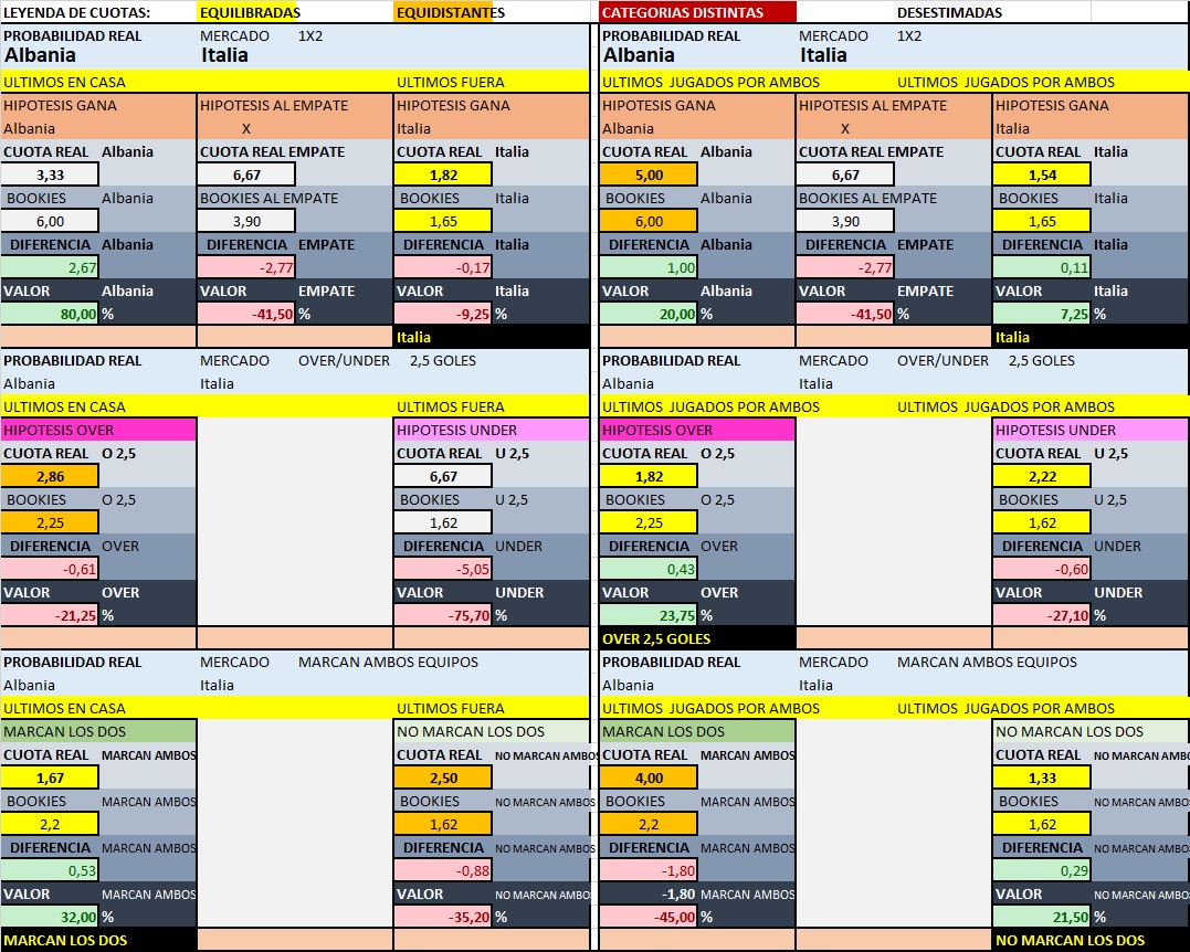La probabilidad real nos deja la cuota a ganador de los visitantes en 1.82 y 1.54, según los dos métodos que utilizamos para sacarla, las bookies la ponen sobre el 1.62, el empate del partido, en ambos métodos nos deja la misma cuota, 6.67, cuando la tenemos en el mercado en 3.90, y la victoria de los albaneses, sale por 3.30 y 5.00, cuando las casas de apuestas nos la dejan en 6.00.