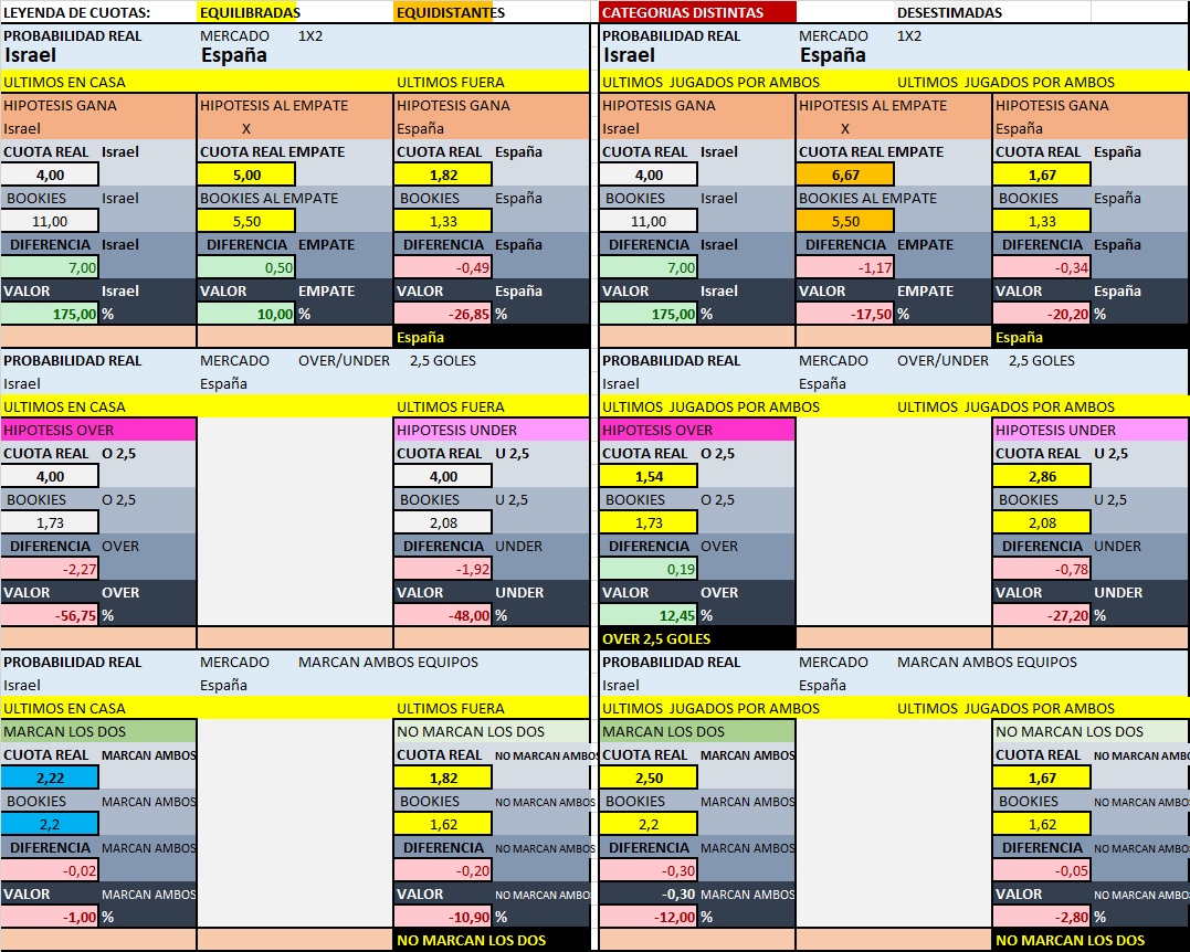 No me voy a estender más, ya que pienso que con esta muestra es suficiente como para ir con ello, la probabilidad real, como entenderemos le da a España como clara favorita, 1.82 y 187, teniendo la cuota en el mercado en 1.33, el empate está equilibrado con el mercado, 5.00 y 6.67, para tener las bookies la cuota 5.5, y la victoria de Israel, la tenemos en 4.00 en ambos métodos, cuando las casas de apuestas la tienen en 11.00.