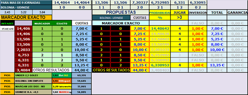 Llegando a este punto del campeonato, los que necesitan sumar para certificar cosas son los que deben de salir más motivados ha sacar el partido, por lo que los locales intentarán tirar el resto, la aplicación nos deja como primer pronóstico, con un 69% de probabilidades el mercado under, con la linea en 3 goles, nos saca los ocho primeros resultados del marcador exacto, 1-0, 0-0, 1-1, 0-1, 2-0,2-1, 1-2, 0-2, todos estos tienen un salto de posibilidades casi del doble, en los cuatro primeros sobre los cuatro segundos, ya que los que mejor opción tienen cumplen entre un 14.4% y un 13.5% de posibilidades que se puedan producir, los cuatro siguientes, se encuentran entre un 7.2% y un 6.3%, por lo que apurando un tanto, y mirando los sutro primeros resultados podemos buscar el mercado al under con la linea de gol en 2.5, la cuota nos sube y voy a buscar este pronóstico.