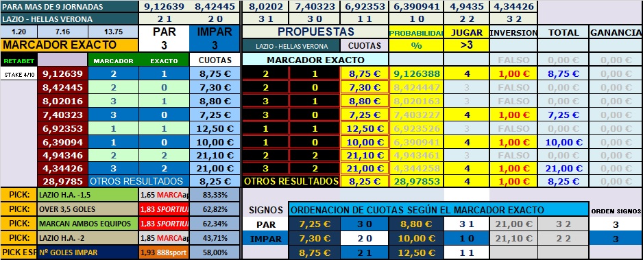 PICK FUTBOL / ITALIA / SERIE A /JORNADA 25 / LUNES 19-2-2018. 20:45 LAZIO - VERONA Nº GOLES IMPAR / CUOTA 1.93 / 888SPORT / STAKE 4/10 Partido de la primera liga de Italia, la Serie A, analizo el encuentro que disputan LAZIO - VERONA, los que hoy juegan de locales, son los quintos clasificados del campeonato, después de 24 jornadas, llevan 14 victoria, 4 empate , 6 derrotas, como podemos ver, la situación los mete en la zona alta en la clasificación con un partido menos que la Roma y el Inter, que están a dos y cuatro puntos respectivamente, los visitantes, el Verona, está en el puesto décimo noveno en la clasificación, recordemos que esta liga son 20 equipos, ha conseguido 4 victoria, 4 partidos empatados, y ha perdido 16 partidos, como vemos equipo que está en la zona de descenso, a 5 puntos del Crotone que es el que se salva de momento. En cuanto a los goles que marcan y encajan, los del local tienen 59 marcados y 33 encajados, como vemos, hace muchísimos goles, encajar los encajan, son alegres, en 24 encuentros llevar 33 goles encajados así lo demuestra, mientras que el visitante, ha marcado 22 y le han marcado 48, vemos que ellos, les hacen más del doble de los que ellos marcan, que por cierto, y por la zona de la clasificación que se encuentran están por debajo del número de encuentros que han disputado, así, si nos vamos al mercado over/under con la línea en el 2.5 goles, los dos equipos son de los más over del campeonato, goles como hemos visto por doquier, los locales son el equipo más over del campeonato, 21-3, los del Verona los cuartos más overs, 16-8. El local como anfitrión, ha ganado 6 de los 11 que ha disputado, 2 empates, con goles marcado y encajados 29-13, como vemos mantiene las proporciones de sus globales, en este caso, hace muchos más goles que le hacen, y estos están por encima de los encuentros disputados , el Verona de visitante 2 partido ganados, 3 empate y ha perdido 7 encuentros, lleva 13 goles marcados y 24 encajados, aquí, encontramos que hacen y les hacen goles, por encima del número de partidos disputados, lleva casi el doble de encajados que marcados, mantiene la proporción de los globales, y les cuesta ganar, tan sólo 2 de 12 disputados. El excel como primer pronóstico, nos deja como primeros mercados la victoria de los locales con un hándicap asiático H.A. -2, yo en esta ocasión me inclino por un mercado como es el de que el número de goles sea IMPAR, los mejores resultados que nos muestra la aplicación para ir con el pronóstico, con un 58% de fiabilidad, le otorga los resultados al marcador exacto, estos resultados como digo son 2-1, 3-0, 1-0, 3-2, las opciones que nos muestra la aplicación en favor de que entre los dos equipos marquen sus goles en una serie impar. Si queremos cerciorarnos, si estos resultados no están lejos de la realidad, podemos ordenarlos, tomando la cotización de cada uno de ellos, de más favorito a menos favorito, es decir, el resultado de menor cuota, será para las casas de apuestas el que más probabilidad de que salga el que ambos equipos marque, en este caso, tomamos los seis primeros, y aquí nos salen 3-0, 2-0, 2-1, 3-1, 1-0 y 1-1, viendo que de los seis resultados con las cotizaciones más bajas, es decir, las más favoritas para las casa de apuestas, en 3 de estas se contempla que se el número de goles que se marquen en el partido sean impares. Sus cuotas las encontramos entre 7.25 y 10.00. Podemos ver que ambos conjunto en sus últimos 30 partidos disputados, para analizar si el mercado par-impar puede ser factible, podemos comprobar que en el 58% de los partidos que han disputado ambos equipos, el resultado fue impar, el equipo local tiene 19 de los 30 partidos analizados, y el visitante, 16, lo que nos lleva a el primero al 63% y el segundo al 53%, lo que hace que su probabilidad, unida a los resultados que nos deja el marcador exacto, pensando que el mercado al over/under nos sale por encima de la línea del 2.5 goles, nos mete los 2-1, 3-0, 3-2 entre los ocho primeros con más posibilidades, hace que se pueda cumplir. Con esta argumentación y los datos que expongo, voy a buscar que el número de goles que se marquen en el partido sea impar. ENLACE MERCADO PAR-IMPARhttps://4.bp.blogspot.com/-54MqodlKoCQ/WosJYhYHiTI/AAAAAAAAwMw/jDSrkaY4dxYp2LV5UAQqsBvFOnzKY45ygCLcBGAs/s1600/jpg9681.jpg ENLACE PORCENTAJEShttps://4.bp.blogspot.com/-ysL3ZfWjVJ8/WosJYoE4d2I/AAAAAAAAwMs/KcwEIewgPOYhV4VqA-GPraQEH0bnM8PSgCLcBGAs/s1600/jpg9682.jpg ENLACE MARCADOR EXACTOhttps://2.bp.blogspot.com/-SBYTEV9vGaQ/WosJYgRz8sI/AAAAAAAAwMo/sZawgGjftKo7DHr61U-7hKTop63LE5sMgCLcBGAs/s1600/jpg9683.jpg