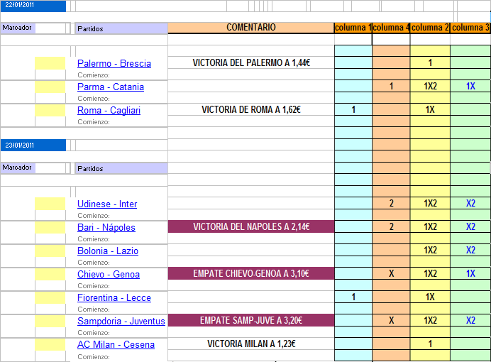 Resultados pick´s ligas españolas y europeas 22-23-24 enero 2011. Resultados Pick´s color purpura:Serie A :