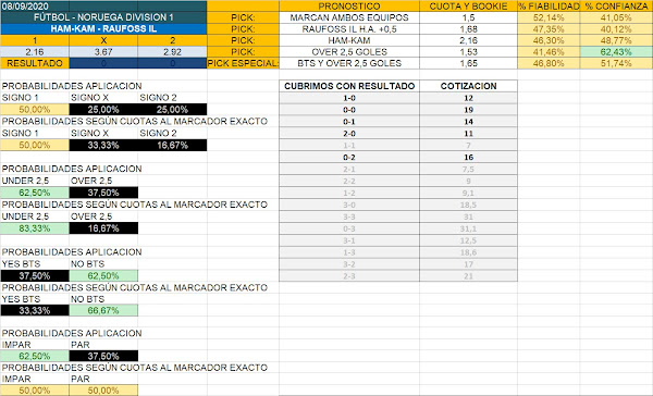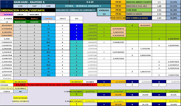 Viajamos a Noruega hasta la Obos-Ligaen donde se enfrentan dos equipos de la parte baja de la tabla. Buscamos 4 goles, y con 3 recuperamos lo invertido. Hamarkameratene es último clasificado, después de 13 partidos lleva 22 goles a favor y 30 en contra, promediando los 4 goles por partido. Respecto a la línea prevista nos dejan: 8 VERDES 1 NULO 4 ROJOS Es cierto que en las últimas 4 jornadas nos deja 1 nulo y 3 fallos ( uno de ellos perdiendo 0-2 en casa contra líder Tromso). Creo que ya va siendo hora de volver a las andadas, y el rival creo que es propicio. Si nos paramos a ver sus partidos en casa nos sale una media 4.5 goles, y de los 6 partidos disputados tenemos 4 verdes ( 5,7,7 y 4) y dos rojos con dos goles, uno de esperar contra el Tromso que solo lleva 9 goles en contra y es líder destacado. Al otro lado del campo Raufoss es 11°, con 13 puntos y un balance de 19 goles a favor y 20 en contra, promediando los 3 goles por partido. Respecto a esta línea nos dejan: 4 VERDES 3 NULOS 6 ROJOS No tiene tan buenos números, pero algunos de los under eran de esperar: Vs Tromso derrota 1-0 Vs Sogndal ( 2°) derrota 1-0 Fuera de casa promedian algo más de 3 goles, y en 7 partidos nos dejan: 2 VERDES 3 NULOS 2 ROJOS. En el h2h entre ambos, en los últimos 6 partidos ( se enfrentan a menudo): 2-1 2-2 2-1 1-2 1-2 4-2 2 VERDES 4 NULOS. Eso es todo, suerte