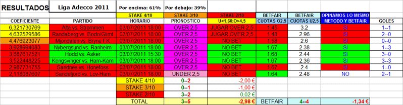 FUTBOL,over/under 2.5 goles,ligas internacionales,1-2-3-4 julio 2011.